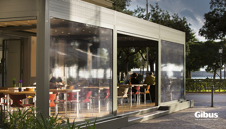 Le tende a caduta Gibus sono disponibili anche in soluzioni con teli oscuranti, ombreggianti, Cristal e zanzariere.